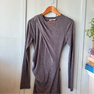 Chic charcoal dress with elegant draping. Perfect for versatile styling.