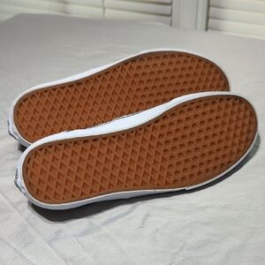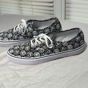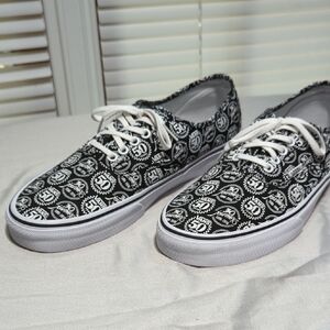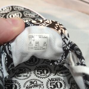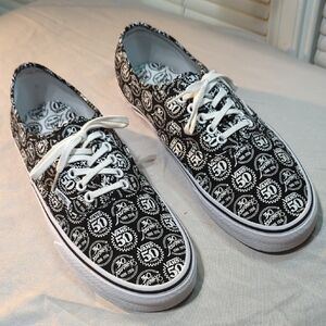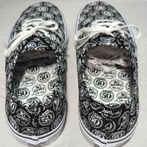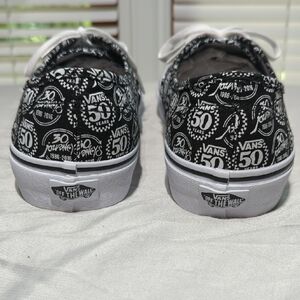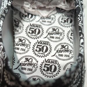 These Vans sneakers feature a bold black and white pattern of Vans 50 years and Journeys 30 years on the canvas upper, complemented by white rubber soles and laces. The classic Vans silhouette and waffle tread pattern ensure both style and functionality, making them perfect for a punk-inspired look. they are basically new, worn once amazing shoes....