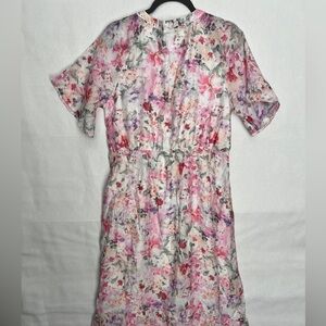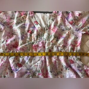 Embrace elegance with this stunning floral pink maxi dress. Fully lined except for the sleeves. The top fabric is more of a sheer fabric. The waistband has a rainbow seam in front and goes lower in the back, with elastic. The fabric does not have a lot of stretch so if you are busty, please look at the measurements. All measurements are taken while garment is laying flat and are approximate. This dress is brand new without tags and has never been worn. It’s perfect for spring time. Beautiful dress.