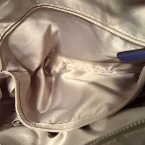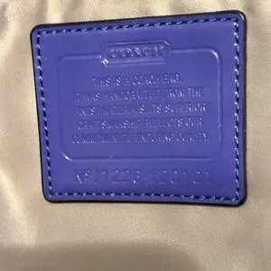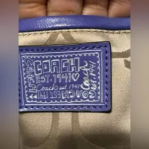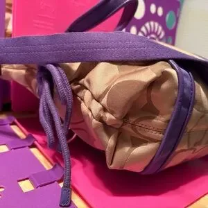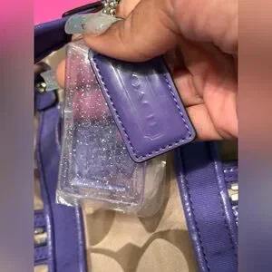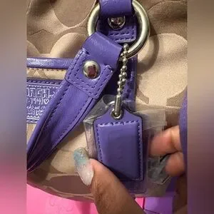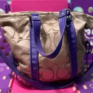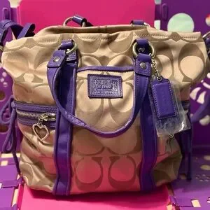 Elegant Coach shoulder bag with a striking tan and purple design. Features signature detailing and a heart charm. Gently used
