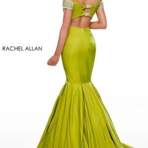 Stunning lime gown with sleek fit. Perfect for pageants, prom or special events. Features elegant cutouts and flowing skirt.