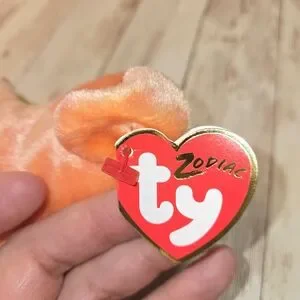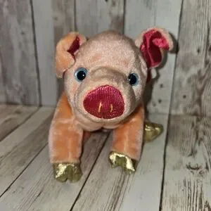 Charming Ty Zodiac Pig plush in bright orange. Features shiny gold hooves and pink ears. Ideal for cuddling and play.