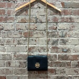 Tory Burch Britten Black Leather Wallet Crossbody Chain Bag Gold Logo