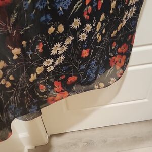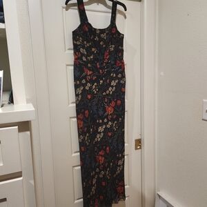 Elegant Talph Lauren black maxi dress with vibrant floral patterns. Features red and blue accents. fitted bodice and flowing chiffon shirt with lining. Ideal for a chic look. Size 6