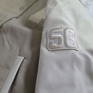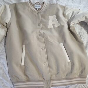 Stylish varsity jacket in beige and cream. Features a bold 'A' patch on the front.