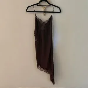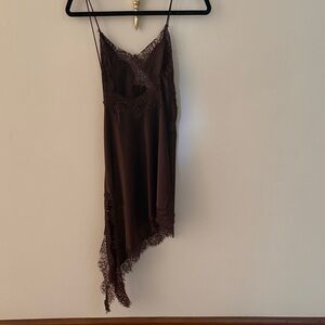 Chic asymmetrical dress with lace details. Rich brown color. Perfect for stylish outings.
