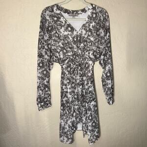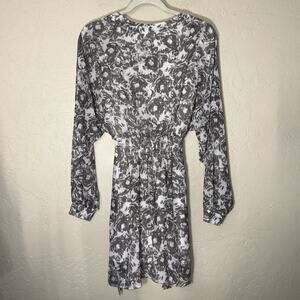 All saints Nicholas Rosa gray shear long sleeve smocked waist dress with pockets. Light grey and white. Color is more like the model photo. My photos are showing up a little darker. Bet wing sleeves. Drop Shoulder.