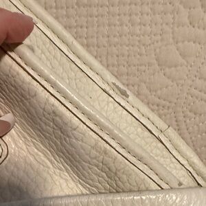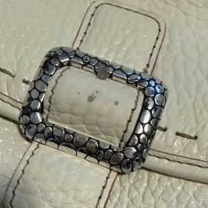 Elegant shoulder bag with cream leather and tan woven texture. Features a decorative buckle and heart charm. Brighton Saddle Bag iIt features a woven straw body with white pebbled leather trim, a magnetic snap closure, and a decorative silver-tone buckle on the flap.