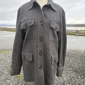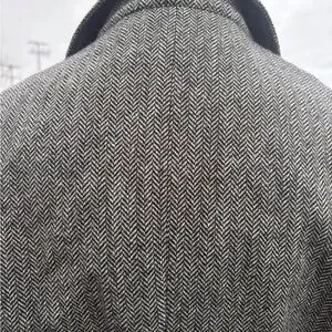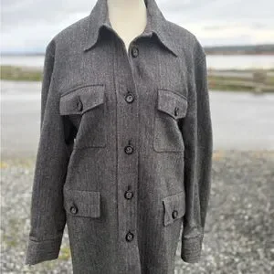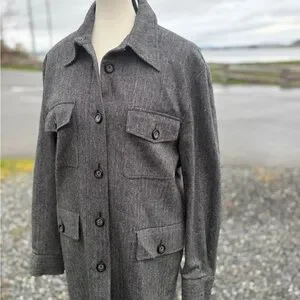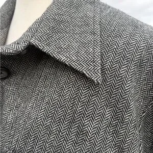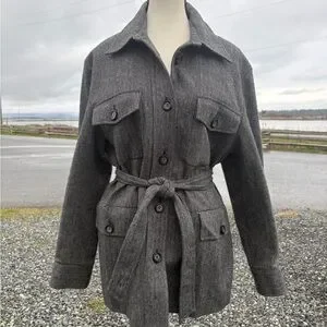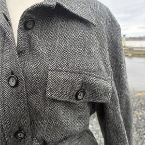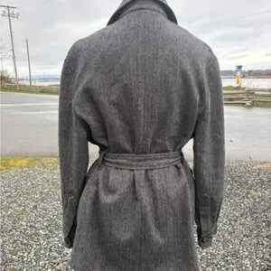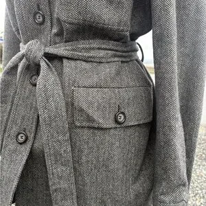 Classic grey herringbone wool coat with button front, chest pockets, and adjustable waist tie. Timeless, tailored, and easy to layer.