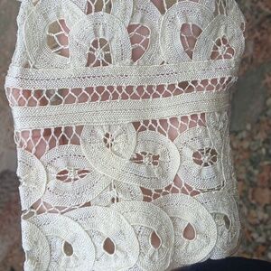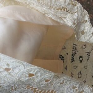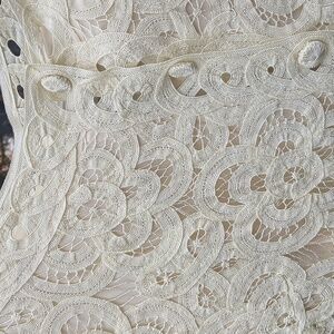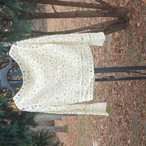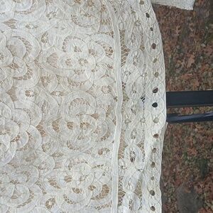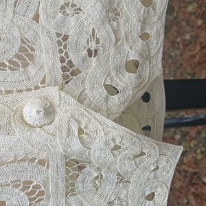 Double D Ranch DDR Cream Crochet Lace Prairie Cropped Cardigan Sz M, EUC. pit to pit 21", sleeve length 24", top to bottom 20.5". Chic cream lace blouse with button-up front. Features intricate floral patterns. Ideal for layering or standalone wear. lined.NEW Double D Ranch Silver Label DDR Cream Crochet Lace Maxi Prairie Cardigan Gorgeous ivory button down cropped cardigan jacket. Beautiful crochet lace over a satin lining. Perfect western, bohemian, cottagecore piece!