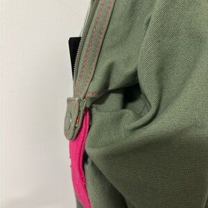 Green and cream tote with pink accent. durable canvas material. Can be adjusted for 3 sizes and styles. Shoulder strap