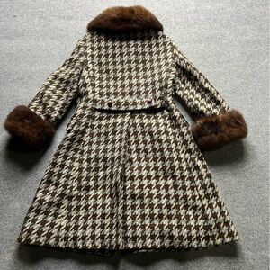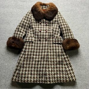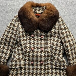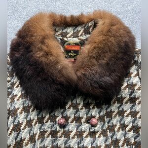 Vintage Wool Houndstooth Coat w/ Real Fur Collar & Cuffs | Fox | Mid-Century
