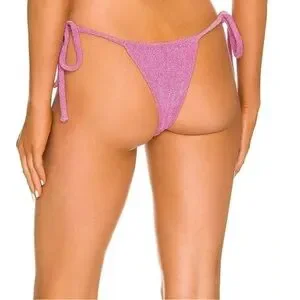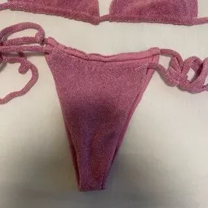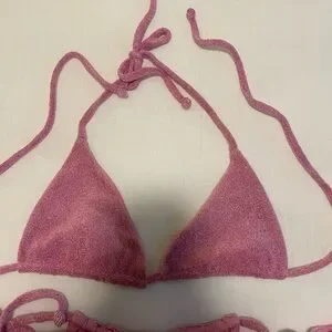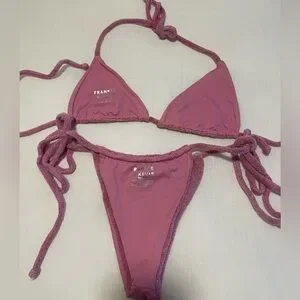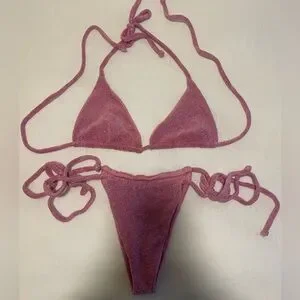 Chic lavender bikini with triangle top. Features adjustable ties for a custom fit. Ideal for sunny beach days.