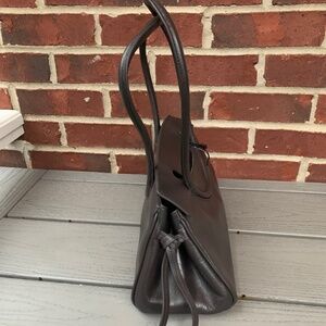 STAUD Maude Shoulder Bag! Features 100% cow leather outer, flap closure with STAUD logo, East/West silhouette, rolled shoulder straps, interior wall pocket, suede interior, expandable gussets with ties, flat base for stability and measures approximately 15" W x 5 1/2" H x 6 1/2" D, with an 8 3/4" strap drop. Excellent condition, no tags, as pictured, with minor marks/creases to leather from store handling as pictured. Dustbag included. Brown. Firm price!