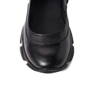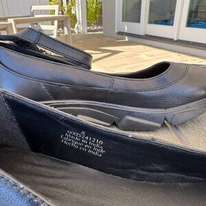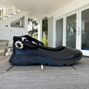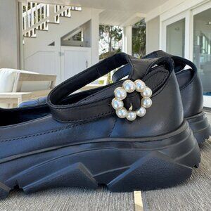 New without box WITH FLAW — right shoe missing 2 pearls. Size 8. Black leather with pearl strap detail and platform sole. (Heel height: approx. 1.5 in). MSRP: $158.