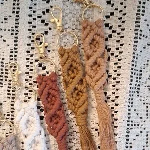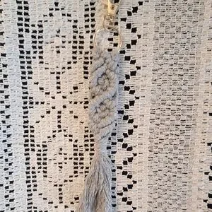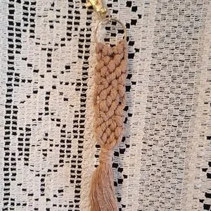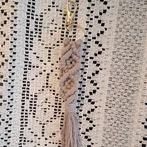 Spruce up your keys and/or bags with our macrame keychain! Each piece is made with quality cotton cord, braided in a beautiful design. There are varying colors all tied at the tassel. 7 inches from clasp to end of tassel. Gray, taupe, white, rust, Carmel, and tan. (Pictured left to right)