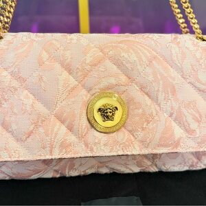 Chic Versace shoulder bag in blush pink with baroque pattern. Features a gold chain strap and signature medallion. Adds elegance to any look. New with tags and box!