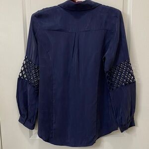 Discover elegance with this navy button down shirt, featuring unique lattice sleeves. Perfect for any occasion. Soft and silky! EXCELLENT CONDITION!