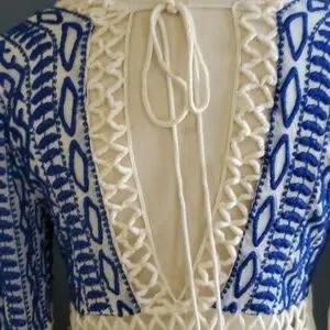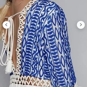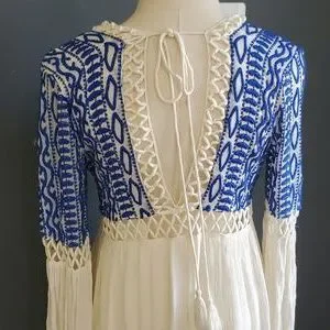 Stylish mini dress with blue patterned top. Cream skirt with lace details. Long sleeves and deep V-neck.