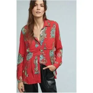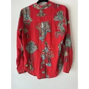 Maeve Anthropologie Whimsy Button Up Shirt Women Sz 6 Red All Over Print Motif