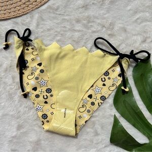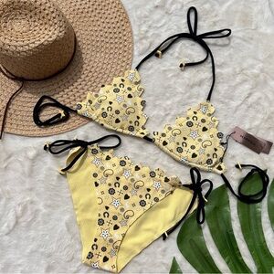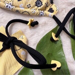 From the Marysia's Summer 2017 collection - New with Tags. A fun and playful take on Marysia's classic styles. Bright yellow color with whimsical bandana motif in shades of pastel-yellow, white and black. Adjustable ties for top and bottom have heart and star charms.