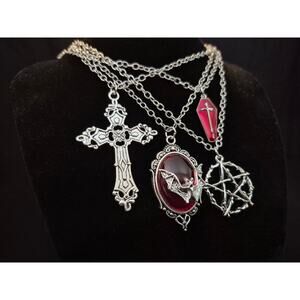This 4-piece vintage necklace set features a unique design with a bat, faux coffin, arrow, red heart, and star pendant. The necklaces are perfect for a birthday occasion and have a vintage style, adding a touch of antique charm to any outfit. Each pendant comes with a lobster closure for easy wear, and the set is signed as "vintage" without being customized. Ideal for those who appreciate vintage and antique jewelry pieces with a trendy twist. 5pcs Y2K Vintage Punk Rock Style Bat, Faux, Coffin, Arrow, Red Heart, Star Pendant Necklace Set, 304L Stainless Steel Chain, Bohemian, Hiphop Fashion,, Great for gift , anniversary, birthday wife , girlfriend, daughter and all occasions.. steampunk retro goth Gothic vampire theme.dark.pentagram , pentacle , spirit spiritual. Free Shipping in the United States..