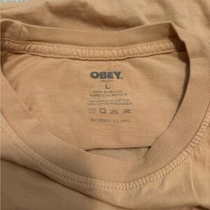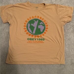 Tan Obey t-shirt with a colorful graphic design. Great condition. Soft material.