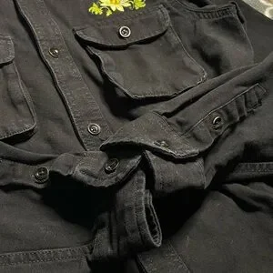 This black button-front utility style jacket features chest flap pockets and beautiful yellow floral embroidery on the chest and hem for a unique streetwear look. Lightweight and perfect for layering year-round.