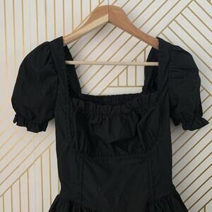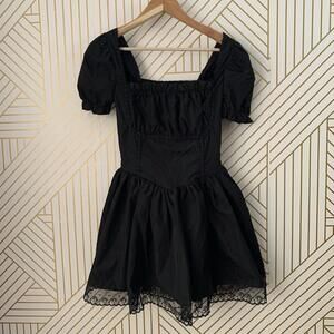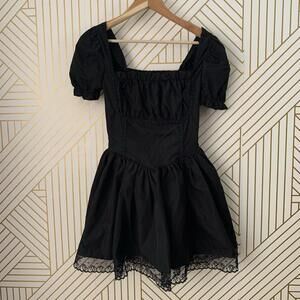 Keywords - lace trim, lace hem, whimsy goth, witch, witchy, Lolita, boatneck, puff sleeves, boat neck, cotton, cotton blend, gothic, whimsical, corset, structured, mini, A line, A-line, Fit & flare