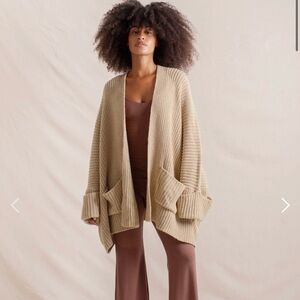 Chic and comfortable Indigo Luna poncho. Soft knit fabric. Ideal for layering. Could benefit from a sweater shaver in a few spots. See second to last photo. Last photo is a stock photo to show the style/fit..the item up for purchase is sage in color and not almond.