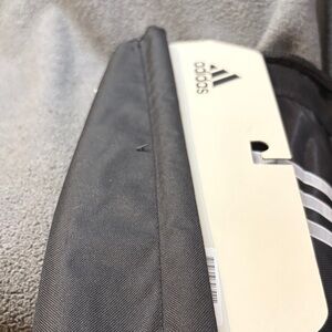 Sleek Adidas backpack with drawstring closure. Features classic white stripes and logo. Ideal for gym or casual outings. Brand new, never used, tags still on.