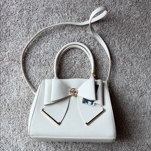 Chic satchel in a sophisticated cream color, featuring an elegant bow design. Perfect for elevating your style. Gold accents.