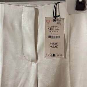 These are gorgeous trousers by Zara! Bought from another posher but they are too small. I did not realize the inseam was so short. The material is heavyweight…very substantial pants. No pleats and no visible waist band. They are new with tags but I found a small ink dot on the front left leg. I am not going to mess with it but would take to dry cleaners if they fit me. Photos don’t do these pants justice. I can’t find them online to show fit. Measures are in photos.