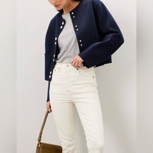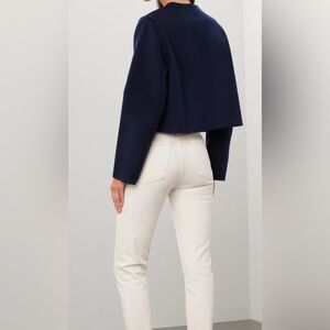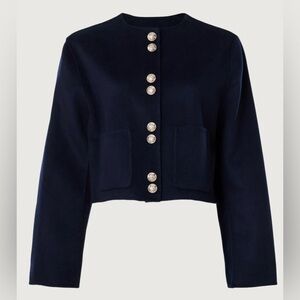 Navy. Blue twill (80% Wool, 20% Polyamide). Jacket. Long sleeve. Crewneck. Front button closure. 19.5" from shoulder to hemline. Imported.
