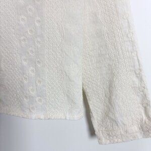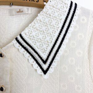 Sellys White Crochet Knit Button Up Blouse with Black Contrast Collar Size Small
