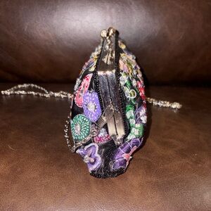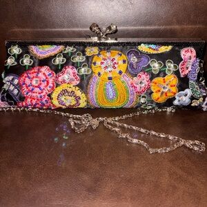 Stylish black clutch with colorful floral embroidery. Features a sleek silver chain. Ideal for evening wear.
