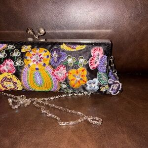 Aldo Black Floral Embroidered Clutch with Silver Chain- Vintage