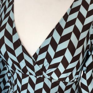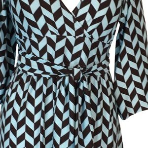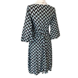 BCBGMaxAzria Blue Brown Chevron Surplice Bell Sleeves Fit n Flare Dress Medium
