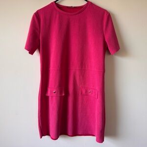 Bold, vibrant hot-pink shift dress from ZARA with a clean, minimalist silhouette. Features short sleeves, a structured straight fit, and two front pocket details finished with subtle gold button accents. The fabric has a smooth, slightly textured feel that holds its shape beautifully.