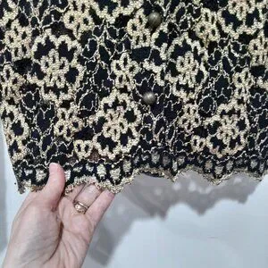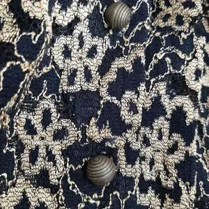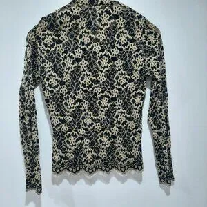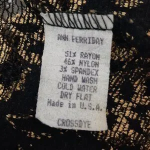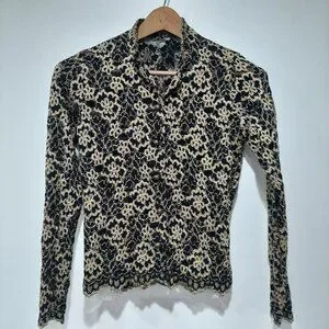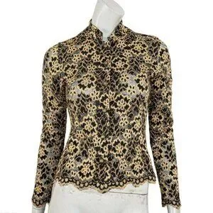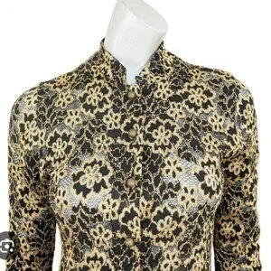 This is a Vintage button up blouse by Ann Ferriday, known for luxury feminine pieces. It has stunning bronze colored buttons that have an almost baroque texture to them. This blouse is super stretchy and is apparently a one size blouse. I'm an extra small and it was kind of loose under the arms so I think it would fit small-med really well. Has a mandarin style collar but can be worn unbuttoned and in many different ways!