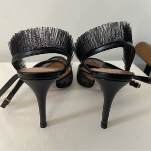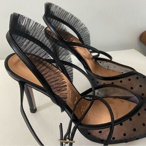 Ted Baker black mesh polka dot stiletto heels with a ruffled ankle strap trim. Excellent condition. Worn once to a dinner and sat the entire time. . #whimsygoth #tedbaker #meshheels #grungechic #blacktie