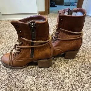 Chic heeled boots with a rustic tan finish. Lace-up design. Perfect for casual outings.