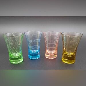 This is a set of four (4) vibrant MCM shot glasses, each featuring a unique color and whimsical design.