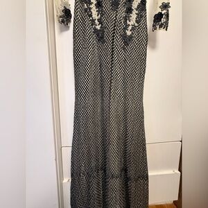 This elegant dress features a stunning black floral design on a cream background, perfect for any special occasion. The intricate detailing adds a touch of sophistication and style.