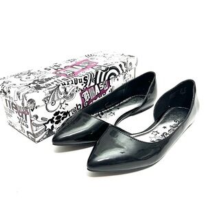 Vintage Y2K deadstock black vegan patent leather pointed toe ballet flats by Brash. Features black vegan patent leather uppers, pointed toe, slip on d'Orsay style, and barely there block heel. Excellent like new vintage condition with original box.