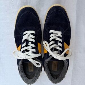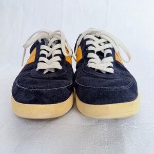 Size 9 Tory Burch Hank Court Sneaker in Navy Suede with Yellow Leather Accents. Terrycloth lining. Super comfortable.