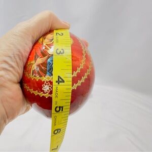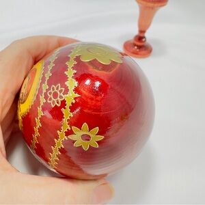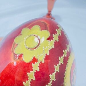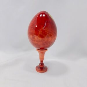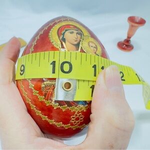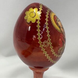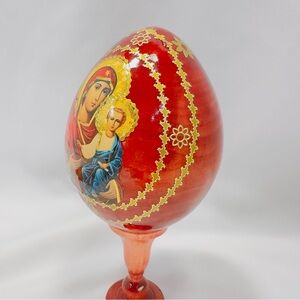 Beautifully crafted decorative egg featuring a religious icon, perfect for adding a touch of elegance to your home decor. The rich red color enhances its visual appeal. With stand 6.25” tall, 4” tall egg, 10” circumference