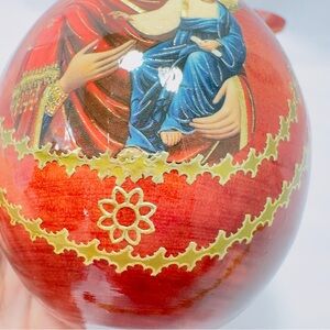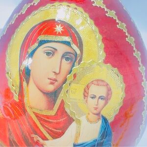 Russian Orthodox Religious Icon Red Gold Tone Decorative Egg Madonna and Child