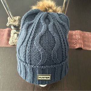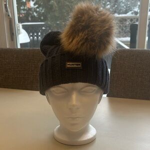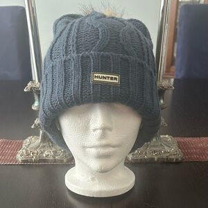 Cozy and chic cable knit beanie with cable cuff and faux fur Pom- Pom from Hunter.