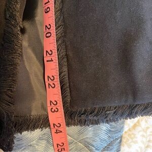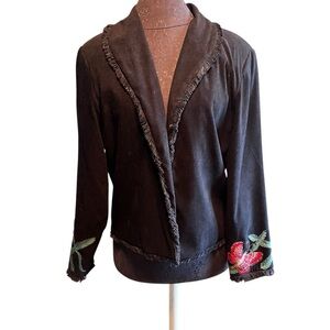 This blazer has a gorgeous butterfly and flowers on the back and sleeves. Subtle fringing on the collar. Open blazer.